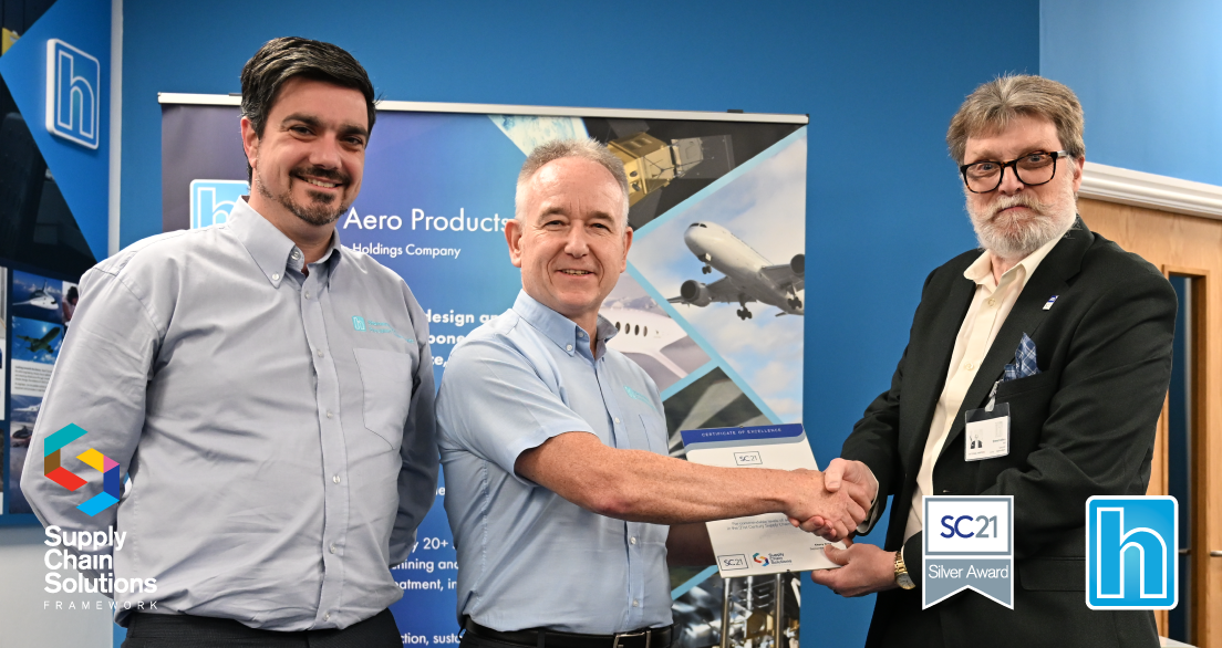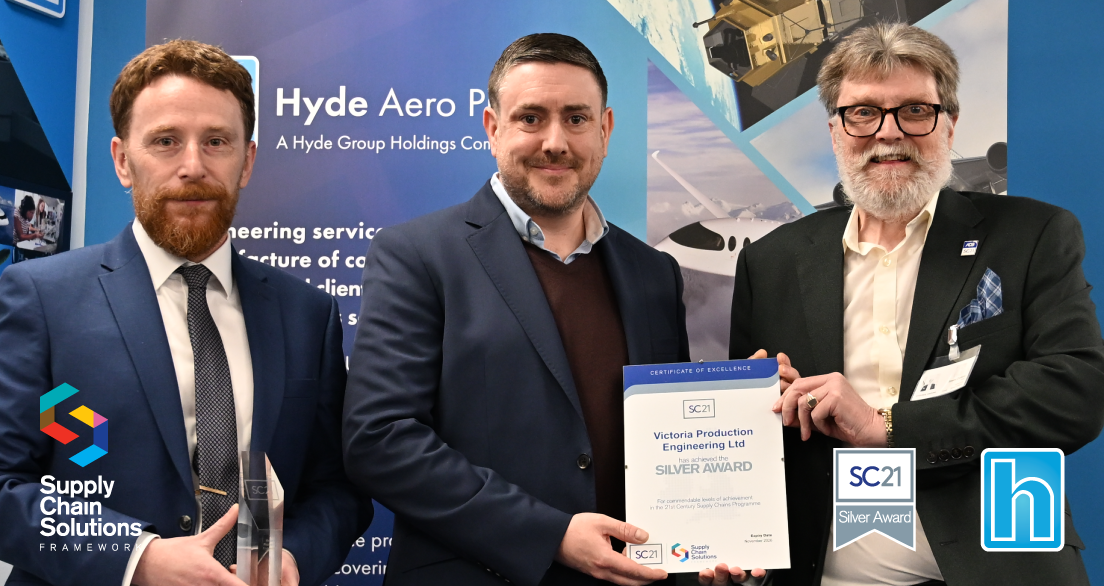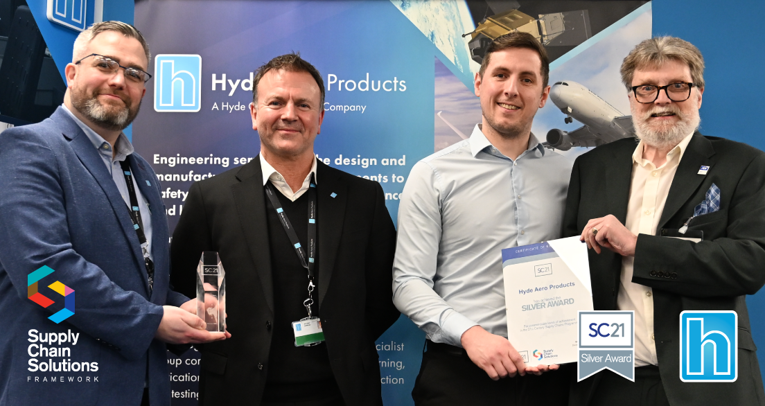In January, Steve Collins, Head of SC21 at ADS, visited Hyde Aero Products division to present four companies with their SC21 Silver awards and certificates: Stoneswood Precision Components (SPC), Victoria Production Engineering (VPE), Hyde Coatings and Hyde Aero Products.